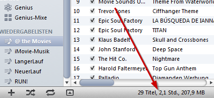 Playlist auf iTunesAlso noch iTunes starten und eine neue Playlist basteln: Je nach Stimmung, Lauftempo und Streckenlänge klicke ich mir die Titel zusammen. Dabei achte ich darauf, dass die Gesamt-Spieldauer zum Lauf-Umfang passt! 😉